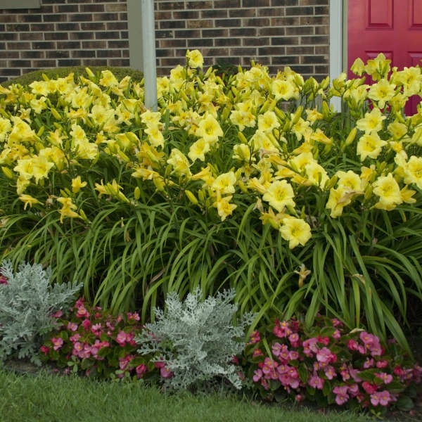 An improved ‘Happy Returns’ with larger flowers and nearly continuous bloom. ‘Going Bananas’ starts to bloom about 1-2 weeks later in early summer, but it blooms nearly continuously into early fall, unlike ‘Happy Returns’ which often stops flowering in August. The 4“, fragrant, canary yellow flowers have recurved, overlapping petals and slightly ruffled margins. They open fully and symmetrically just above the semi-evergreen foliage. The plants display excellent 3-way branching, producing 10-15 well-spaced flowers per scape. Diploid.